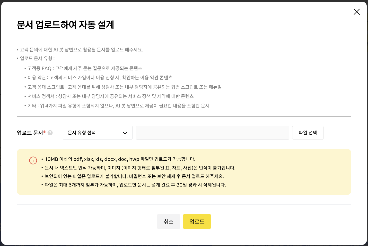 AI 자동 설계 기능을 사용하려면, ‘문서 업로드하여 자동 설계’ 버튼을 선택 하신 뒤 ‘문서 업로드하여 자동 설계’ 팝업에서 봇 답변 설계에 활용될 파일을 선택해 등록해 주시면 됩니다.