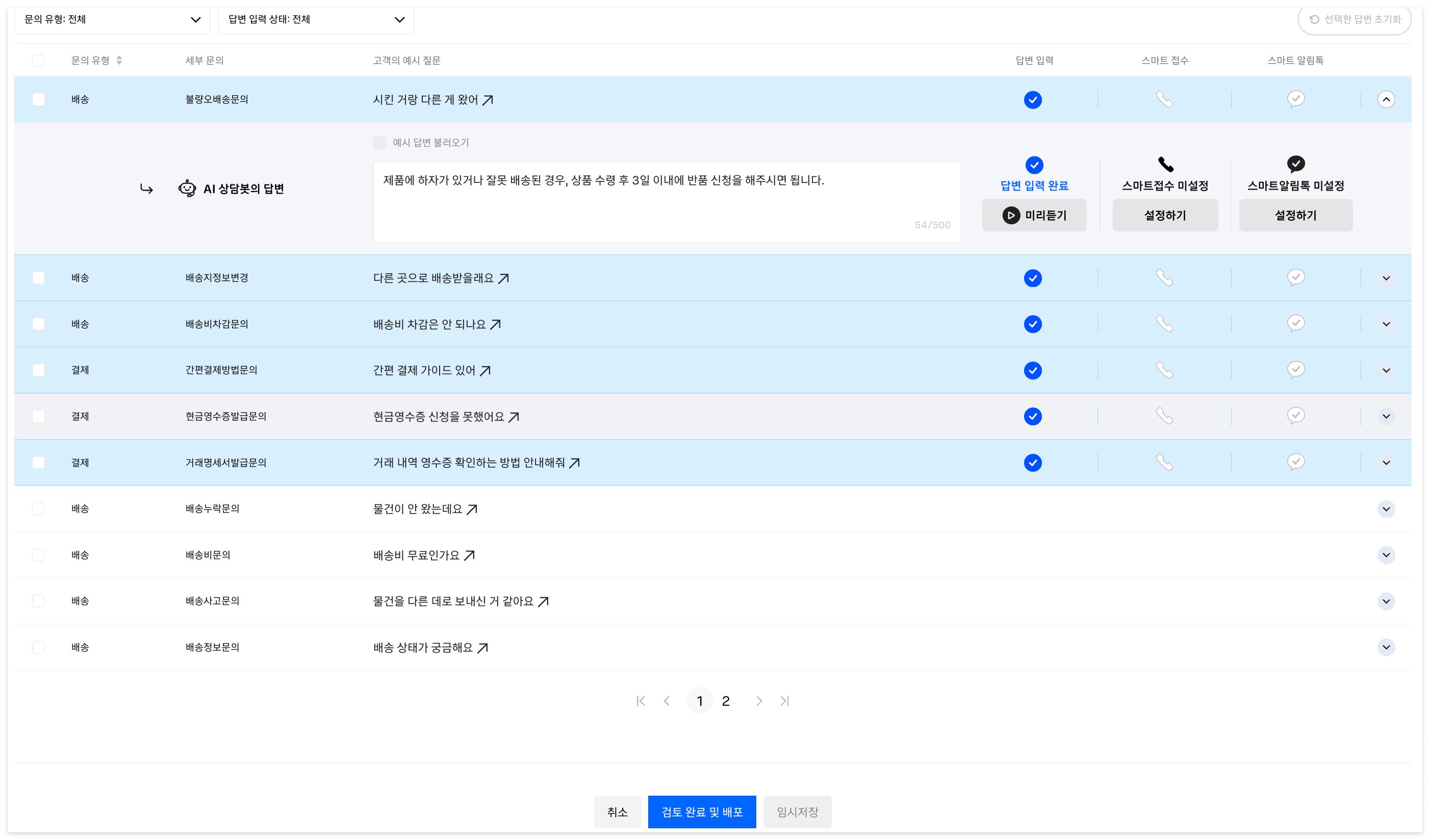 AI가 생성한 답변이 정확한 내용을 담고 있는지, 담당자가 ‘문의별 답변’과 ‘키워드별 답변’ 내용을 꼼꼼하게 검토를 한 뒤 ‘검토 완료 및 배포’ 버튼을 누르면 끝! 콜봇이 생성된 답변으로 고객 응대를 하게 됩니다.